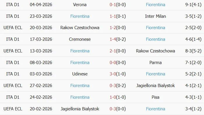 Thống kê phong độ 10 trận đấu gần đây của Fiorentina