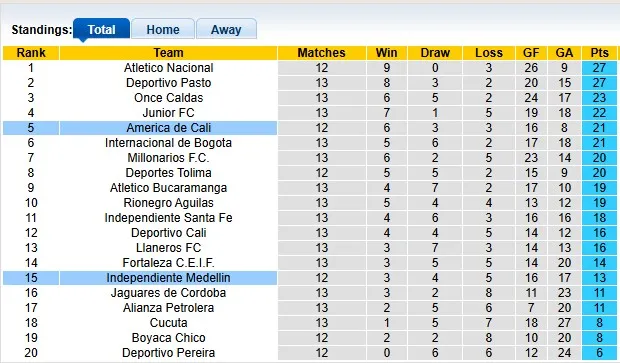 Với sự tiến bộ dù nhỏ nhưng quan trọng, Independiente Medellin đã vươn lên vị trí thứ 15 trên bảng xếp hạng sau 12 vòng đấu. Đội bóng này có 13 điểm và đứng thứ 15, trong khi đối thủ của họ trong trận đấu này, America de Cali, đang đứng thứ 5 với thành tích ấn tượng.
