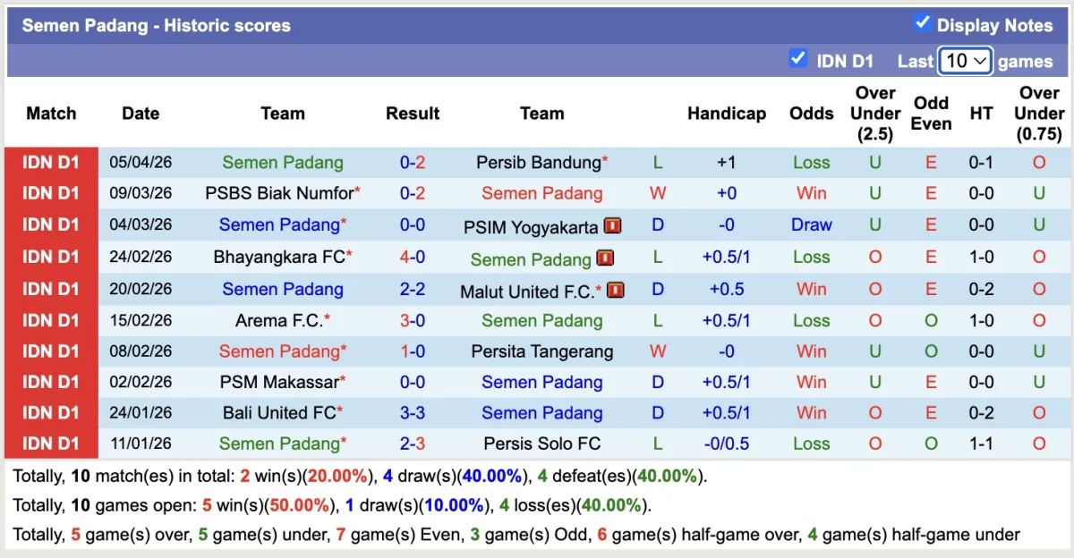 – Thống kê phong độ 10 trận gần nhất của Semen Padang