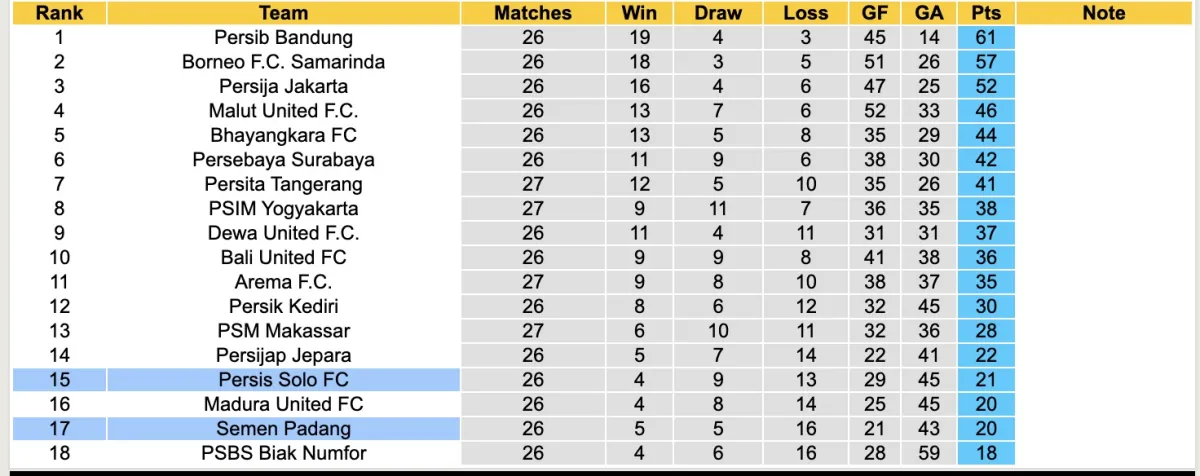 Ở phía bên kia chiến tuyến, Persis Solo cũng đang khiến cho người hâm mộ cảm thấy lo lắng khi chỉ có được 4 chiến thắng và 13 thất bại sau 26 trận mùa này. Hiện tại, đội bóng này đứng thứ 15 trên bảng xếp hạng, chỉ hơn nhóm xuống hạng 1 điểm.