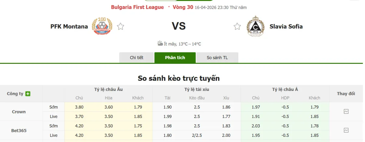 Dự đoán tỷ lệ bóng đá, soi kèo Montana vs Slavia Sofia