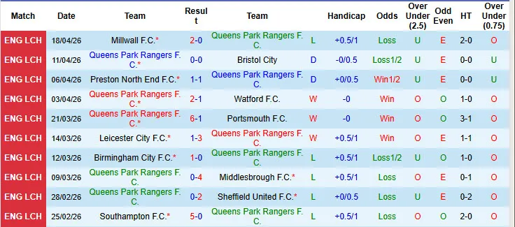 Thống kê phong độ 10 trận đấu gần nhất của Queens Park Rangers