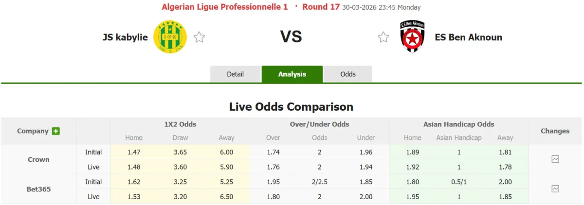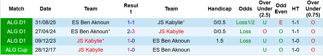 3 trong số 4 trận đối đầu gần đây giữa JS Kabylie và ES Ben Aknoun có không quá 2 bàn thắng được ghi mỗi trận. 2 trận đấu gần đây của JS Kabylie chỉ có 1 bàn thắng được ghi. 3/4 trận đấu gần đây của ES Ben Aknoun cũng có không quá 1 bàn/trận.