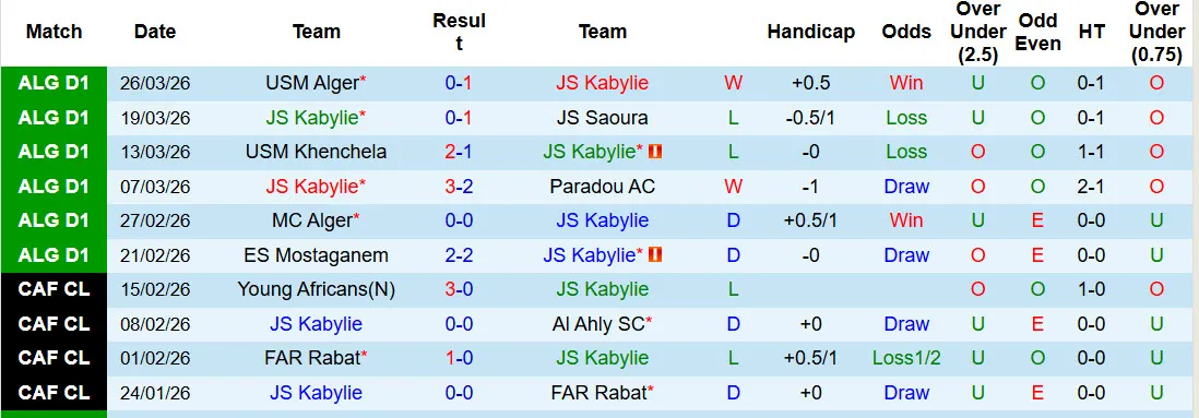 Thống kê phong độ 10 trận đấu gần nhất của JS Kabylie