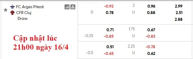 Arges có lợi thế sân nhà, nhưng mức kèo châu Á dành cho họ chỉ là 0:0. Arges đã thắng kèo châu Á trong 3/4 trận gần đây, trong khi đội khách cũng có 7/10 trận thắng kèo. Hai đội có sự tương đồng về kèo với 1 đội thắng 4 và 1 đội thắng 5 trong 10 trận đối đầu vừa qua.