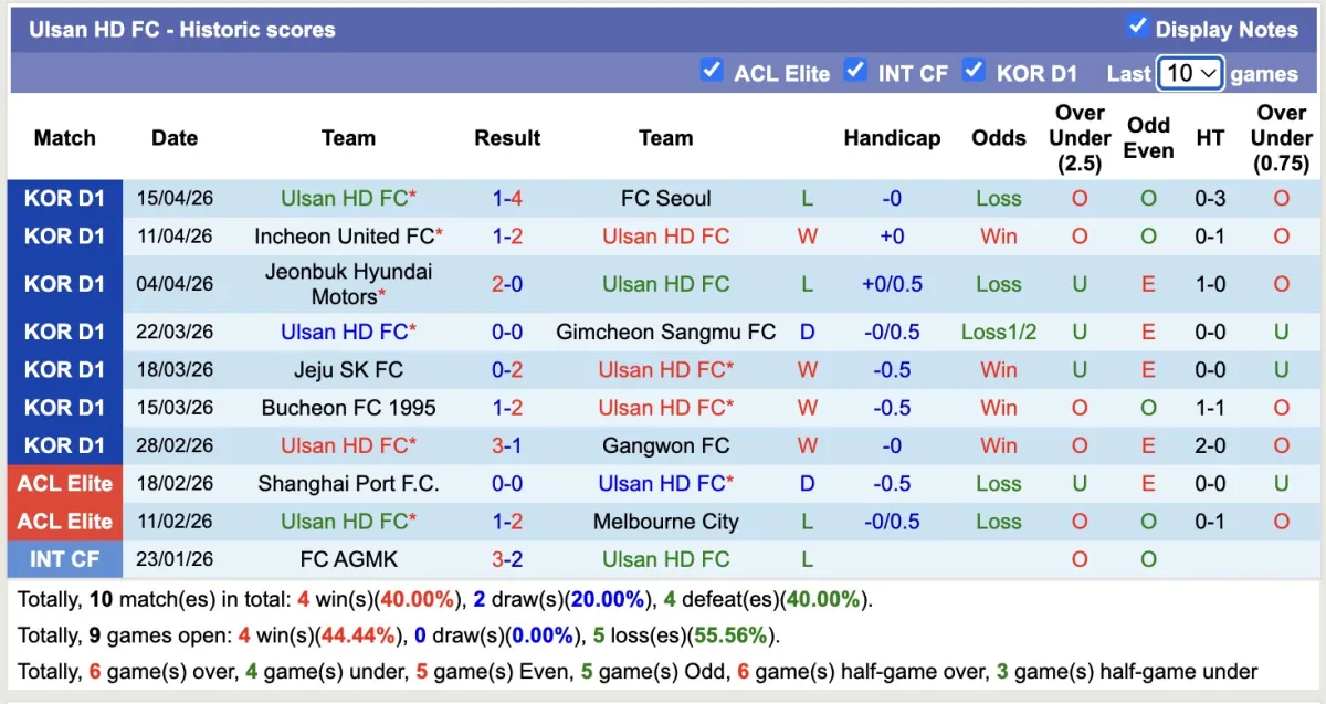 -Thống kê phong độ 10 trận đấu gần nhất của Ulsan HD