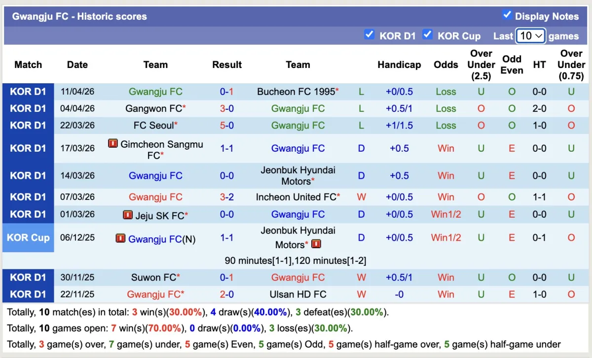 -Thống kê phong độ 10 trận đấu gần nhất của Gwangju