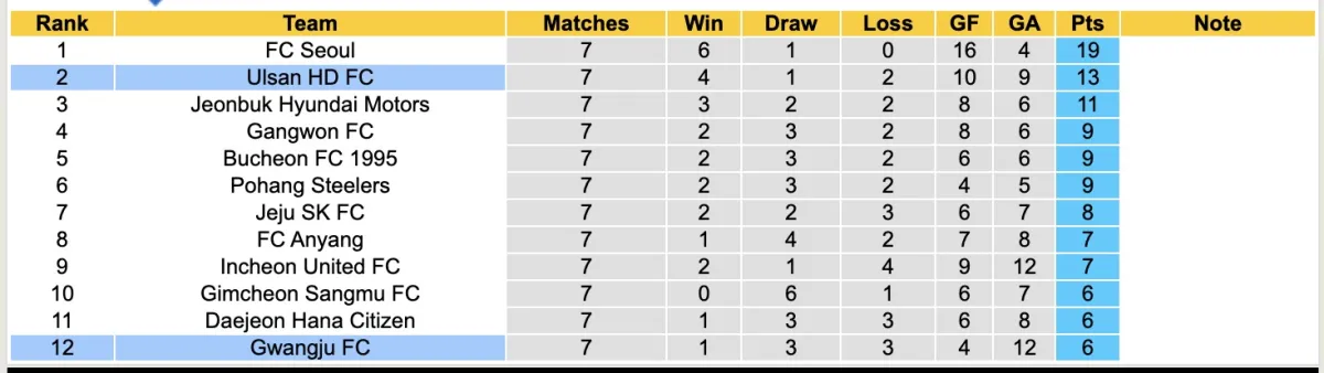 Gwangju ở mùa giải trước có một màn trình diễn tạm chấp nhận khi đứng thứ 7. Tuy nhiên, mùa giải năm nay, đội khách đang khởi đầu không tốt và với những gì họ thể hiện, khả năng sẽ gặp nhiều khó khăn khi đang đứng cuối bảng.