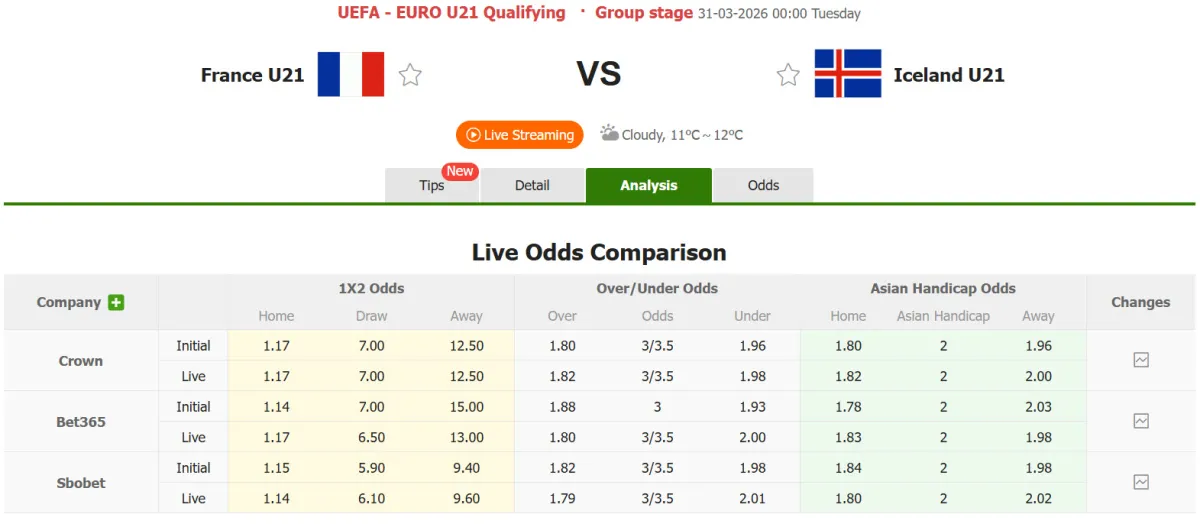 U21 Pháp đã thua kèo 4 trong 5 trận đấu gần đây khi gặp U21 Iceland, và thua kèo 2 trong 3 trận đấu gần nhất. Trong khi đó, U21 Iceland bất bại kèo trong 8 trong số 11 trận đấu vừa qua tại mọi mặt trận.