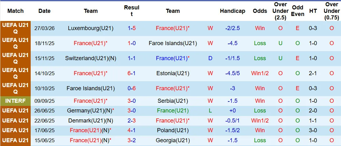 Thống kê phong độ 10 trận đấu gần nhất của U21 Pháp.