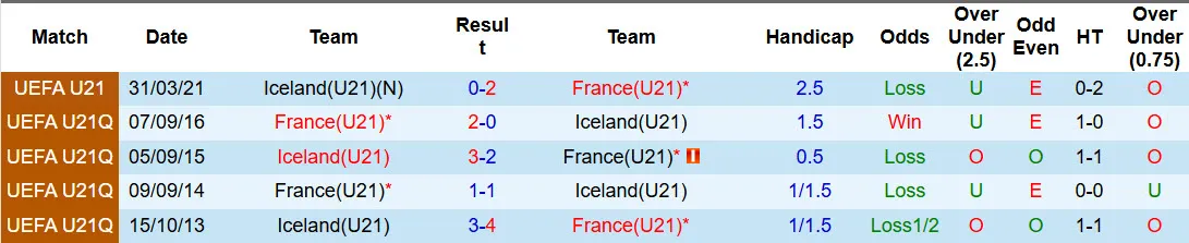 3 trong 4 trận đối đầu gần đây giữa U21 Pháp và U21 Iceland chỉ có 2 bàn thắng được ghi mỗi trận. 2 trong 3 trận đấu gần đây của U21 Pháp có tỷ số xỉu 3 1/2, trong khi 4 trong 6 trận đấu gần nhất của U21 Iceland cũng có tỷ số xỉu 3 1/2.