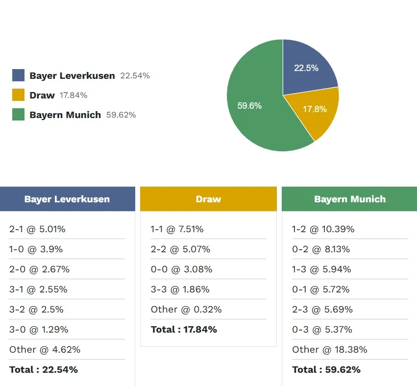 Tỷ số có khả năng xảy ra nhất cho chiến thắng của Bayern Munich là 2-1 với xác suất 10,39%. Các tỷ số khả dĩ tiếp theo là 2-0 (8,13%) và 3-1 (5,94%). Tỷ số chiến thắng có khả năng xảy ra nhất cho Leverkusen là 2-1 (5,01%), trong khi tỷ số hòa có khả năng là 1-1 (7,51%).