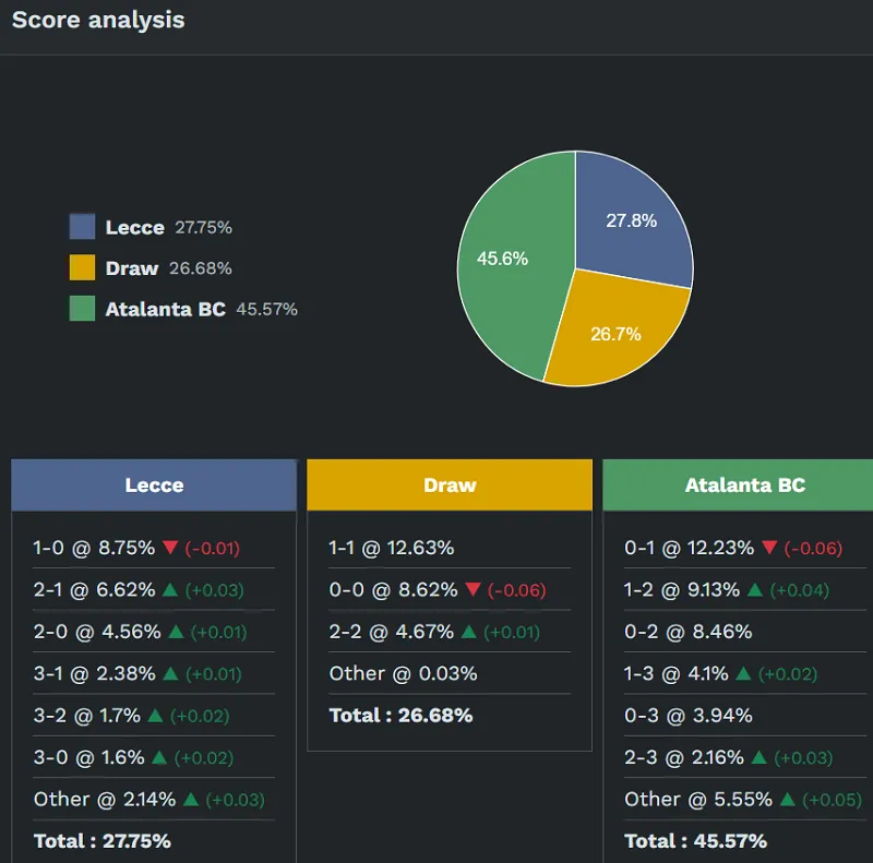 – Về tỷ số, nếu Lecce giành chiến thắng, tỷ số có khả năng cao nhất sẽ là 1-0 (khoảng 8,75%). Nếu hai đội hòa nhau, tỷ số có khả năng cao nhất sẽ là 1-1 (khoảng 12,63%). Trong trường hợp Atalanta giành chiến thắng, tỷ số có khả năng cao nhất sẽ là 0-1 (khoảng 12,23%).