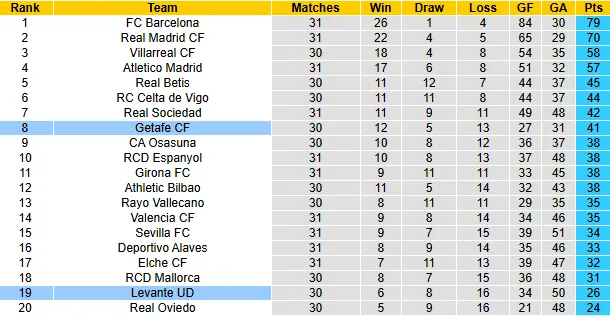 Ngược lại với sự yếu ớt của Levante, Getafe đang thể hiện mình như một đội bóng khó chịu nhất La Liga nhờ triết lý chơi thực dụng của HLV Jose Bordalas. Với 4 chiến thắng trong 5 trận gần đây, đội bóng ngoại ô Madrid đang tiến gần đến Top 6 với một hàng phòng ngự vững chắc – chỉ để thủng lưới 31 bàn, thành tích phòng ngự chỉ đứng sau hai ông lớn Real Madrid và Barcelona. Khả năng bảo vệ thành quả của Getafe thực sự đáng nể, biến những bàn thắng ít ỏi của họ thành những điểm số vô cùng quý giá.