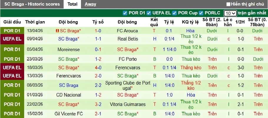Thống kê phong độ của Braga trong 10 trận đấu gần đây.