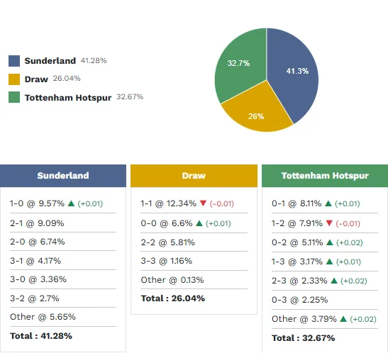 Dựa trên phân tích về phong độ thi đấu và số liệu thống kê của các cầu thủ, khả năng cao xảy ra nhất ở trận đấu này là Sunderland thắng với tỷ lệ 41.3%. Tottenham giành chiến thắng có xác suất 32.7%, trong khi khả năng hòa là 26%.