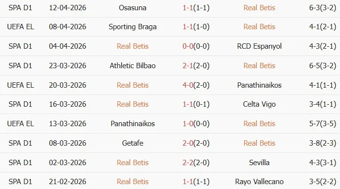Thống kê phong độ 10 trận đấu gần nhất của Real Betis