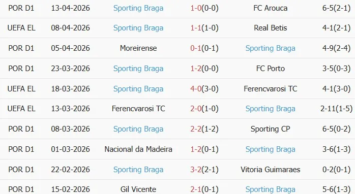 Thống kê phong độ 10 trận đấu gần nhất của Braga