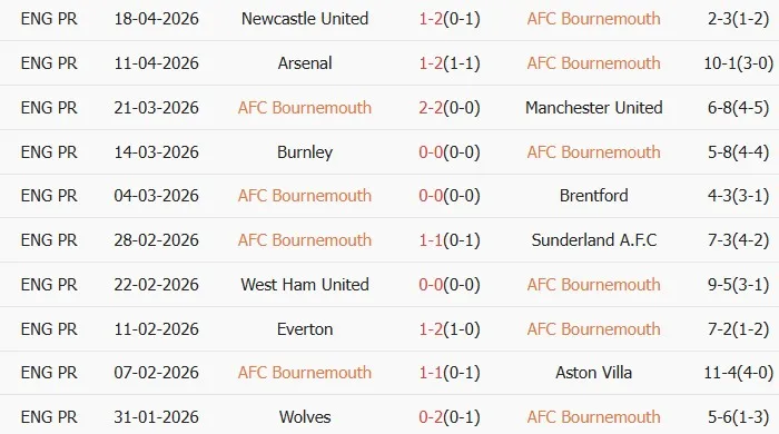 Thống kê phong độ 10 trận đấu gần nhất của Bournemouth