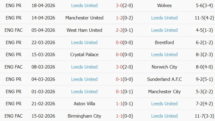 Thống kê phong độ 10 trận đấu gần nhất của Leeds
