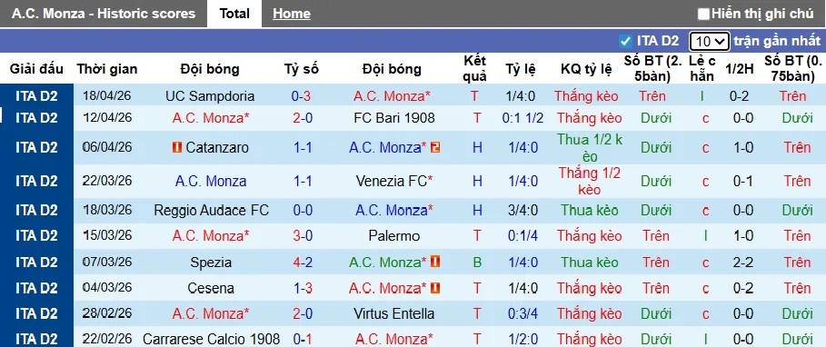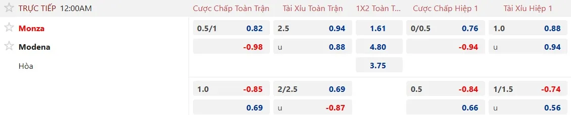 Monza bước vào trận đấu này với thành tích kèo châu Á khá ấn tượng, thắng 3/4 trận gần nhất. Trên sân nhà, họ đã toàn thắng kèo châu Á trong 5 trận đấu gần đây. Ngược lại, Modena lại trải qua chuỗi 5 trận không thắng kèo châu Á với 2 thất bại và 3 trận hòa.