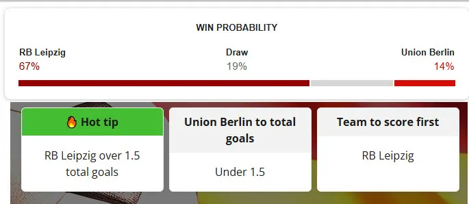 Về phía Union Berlin, đội bóng này vừa trải qua 2 trận thua liên tiếp tại giải VĐQG Đức, và người hâm mộ cần cẩn trọng khi đặt niềm tin vào họ. Theo tính toán của siêu máy tính, tỷ lệ chiến thắng của Union Berlin trong trận đấu đêm nay chỉ là 14%. Còn lại, RB Leipzig và Union Berlin có khả năng kết thúc với tỷ số hòa được máy tính dự đoán với tỷ lệ 19%.