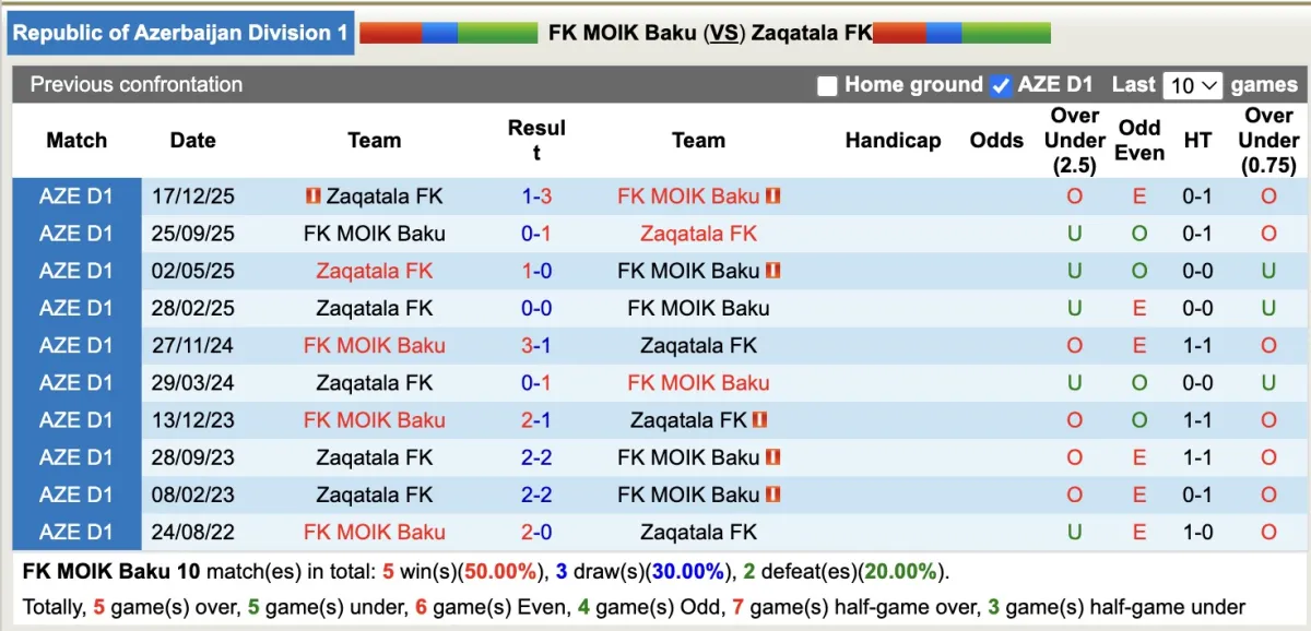 Trong lần đối đầu gần nhất giữa hai đội vào tháng 12 năm 2025, FK MOIK Baku đã có một chiến thắng khá dễ dàng với cách biệt 2 bàn. Hiện tại, Zaqatala FK đang có phong độ kém cỏi, khi trong 7 trận xa nhà gần đây họ không biết đến chiến thắng và để thua đến 4 trận. Có lẽ FK MOIK Baku sẽ là lựa chọn sáng giá trong kèo châu Á.