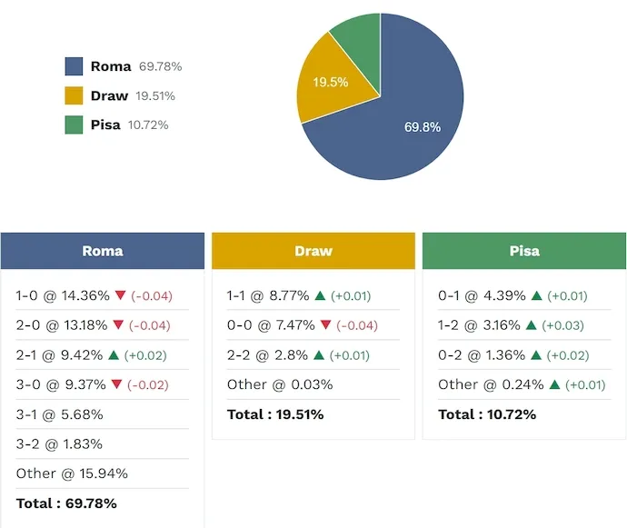 Tỷ số khả dĩ nhất cho chiến thắng của Roma là 1-0 với xác suất 14,36%. Các tỷ số tiếp theo có khả năng xảy ra là 2-0 (13,18%) và 2-1 (9,42%). Tỷ số hòa có khả năng xảy ra cao nhất là 1-1 (8,77%), trong khi tỷ số cho chiến thắng của Pisa là 0-1 (4,39%).