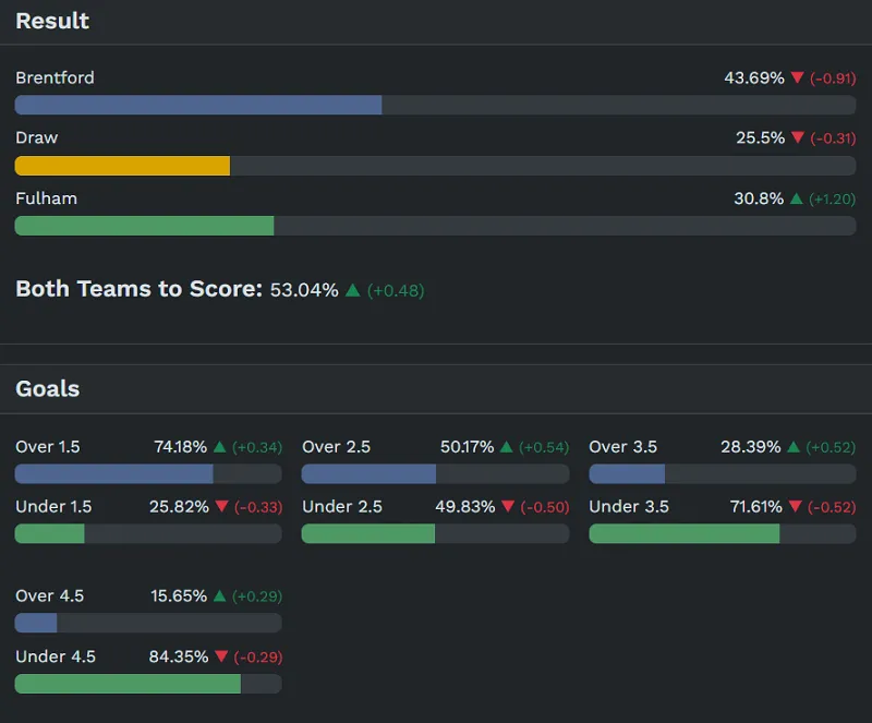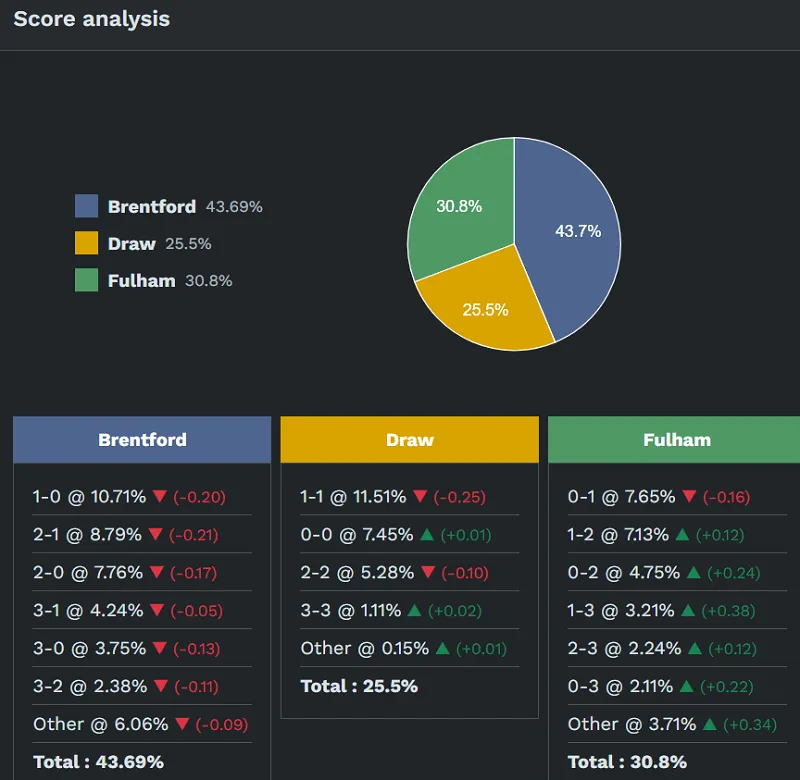 – Về tỷ số, nếu Brentford giành chiến thắng, tỷ số có khả năng xuất hiện cao nhất là 1-0 (khoảng 10,71%). Nếu hai đội hòa, tỷ số cao nhất có khả năng xuất hiện là 1-1 (khoảng 11,51%). Trong trường hợp Fulham giành chiến thắng, tỷ số có khả năng cao nhất là 0-1 (khoảng 7,65%).