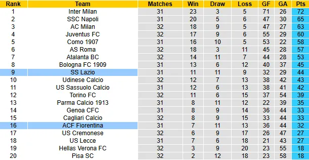 Về phía Lazio, dưới sự dẫn dắt của HLV Maurizio Sarri, đội bóng này cũng đang trải qua một mùa giải đầy biến động và không đạt được kỳ vọng. Hiện tại, với vị trí thứ 9 trên bảng xếp hạng, giấc mơ tham dự Champions League của đội bóng thành Rome gần như không còn, buộc họ phải tập trung vào đấu trường Coppa Italia. Mặc dù đang có chuỗi 4 trận bất bại, nhưng trận hòa đáng tiếc 2-2 trước Parma gần đây đã bộc lộ sự thiếu quyết đoán của Lazio trong những tình huống quan trọng.