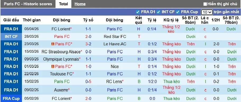 Thống kê phong độ 10 trận gần nhất của Paris FC.