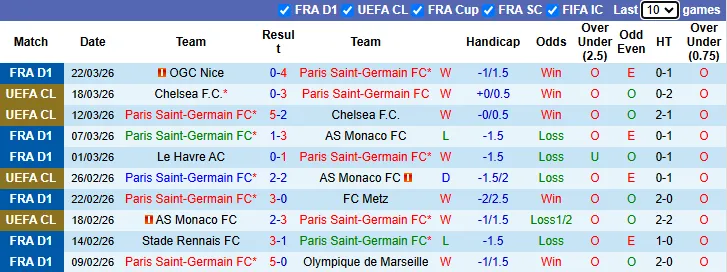 Thống kê phong độ 10 trận gần nhất của PSG