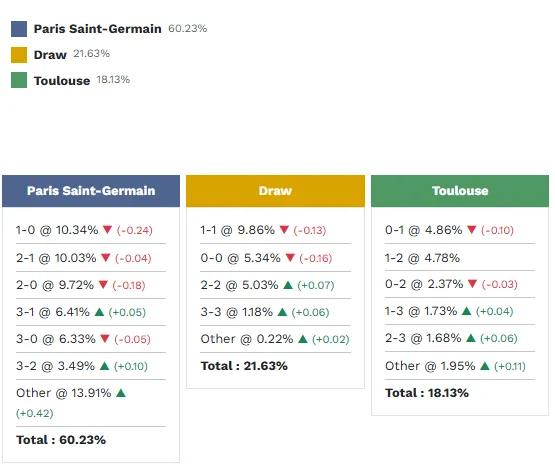 Dựa vào phân tích phong độ thi đấu và các số liệu thống kê của từng cầu thủ, khả năng cao nhất ở trận đấu này là PSG thắng với xác suất 31.1%. Đối với Toulouse, khả năng giành chiến thắng là 46.42%, trong khi tỷ lệ hòa là 22.49%.