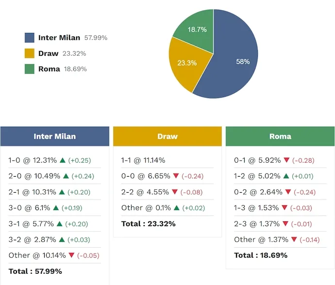 Tỷ số khả thi nhất cho chiến thắng của Inter Milan là 1-0 với xác suất 12,31%. Các tỷ số tiếp theo có khả năng xảy ra là 2-0 (10,49%) và 2-1 (10,31%). Tỷ số hòa có xác suất cao nhất là 1-1 (11,14%), còn khả năng Roma thắng với tỷ số 0-1 là 5,92%.