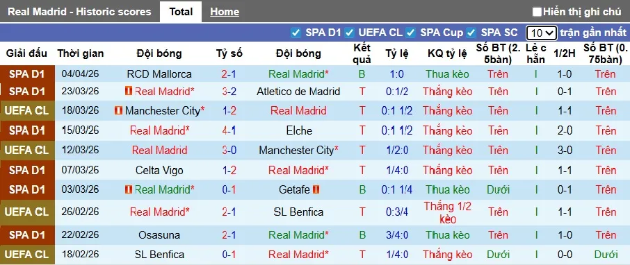 Thống kê phong độ 10 trận đấu gần đây của Real Madrid.