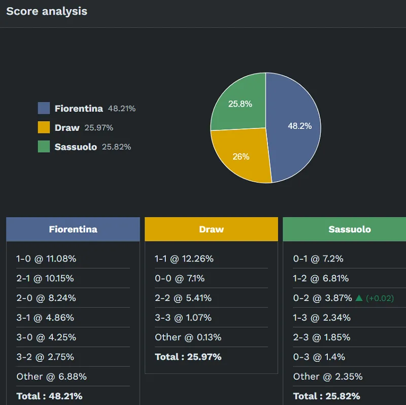 – Về tỷ số, nếu Fiorentina giành chiến thắng, tỷ số có khả năng cao nhất là 1-0 (khoảng 11,08%). Nếu hai đội hòa, tỷ số khả thi nhất là 1-1 (khoảng 12,26%). Nếu Sassuolo giành chiến thắng, tỷ số có khả năng cao nhất là 0-1 (khoảng 7,2%).