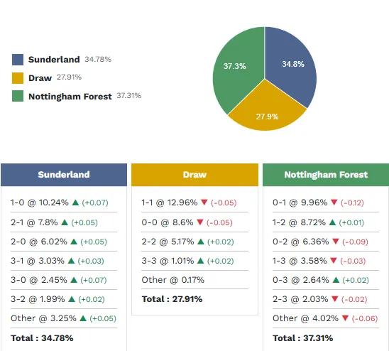 Trong đó, Sunderland có khả năng thắng với tỷ số 1-0 là 10.24%. Tỷ số hòa 1-1 cũng có khả năng xảy ra với xác suất 12.96%. Trong khi đó, Nottingham có thể thắng với tỷ số 1-0 với tỷ lệ 9.96%.