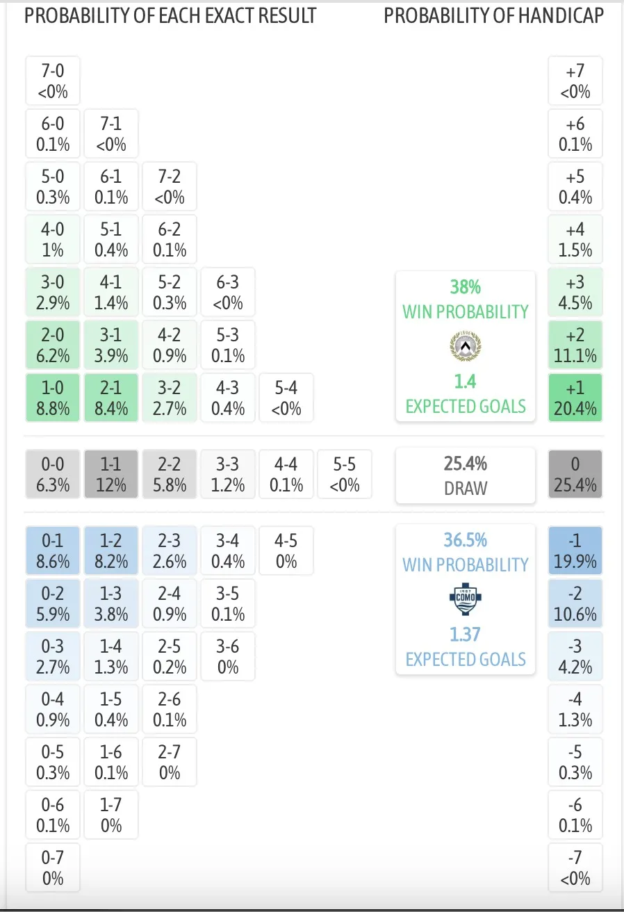 Dự đoán từ Footystats cho thấy khả năng giành chiến thắng của Udinese là 38%. Trong khi đó, khả năng thắng của Como thấp hơn một chút với 36.5%. Tỷ số hòa có xác suất là 25.4%.