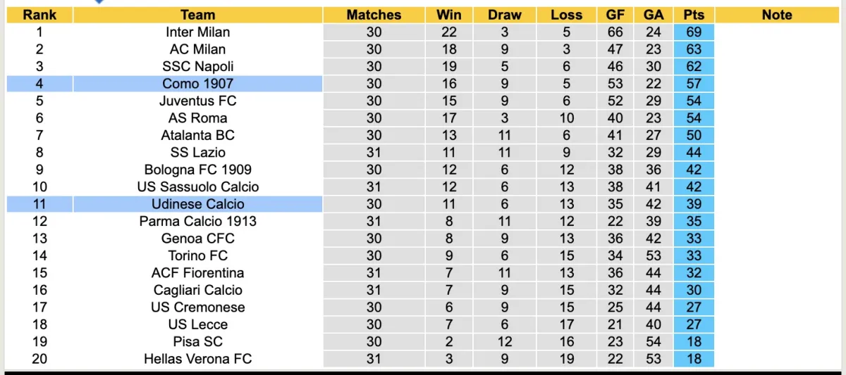 Thêm vào đó, theo thống kê chuyên môn, chỉ số bàn thắng kỳ vọng của Como hiện chỉ đạt 1.37, cho thấy khả năng tạo ra cơ hội và dứt điểm của họ chưa được đánh giá cao. Con số này chỉ thấp hơn một chút so với mức 1.4 của Udinese.