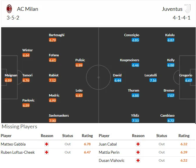 Thông tin lực lượng và đội hình dự kiến của AC Milan và Juventus