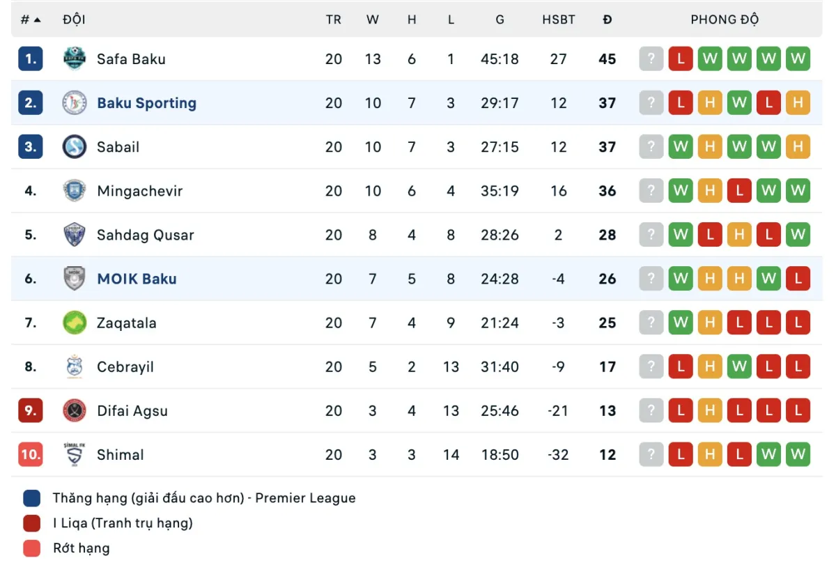 – Thống kê phong độ 10 trận gần nhất của MOIK Baku