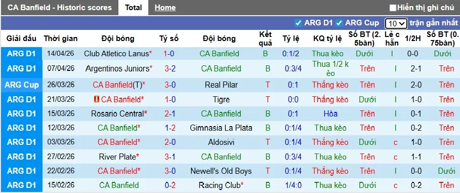 Thống kê phong độ 10 trận gần đây của Banfield.