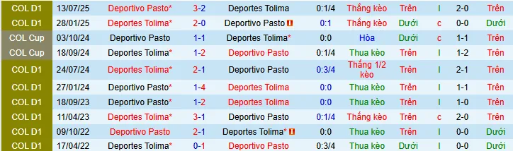 Lịch sử đối đầu giữa Deportivo Pasto và Deportes Tolima.
