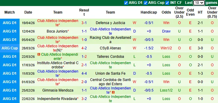 Thống kê phong độ 10 trận gần nhất của Independiente