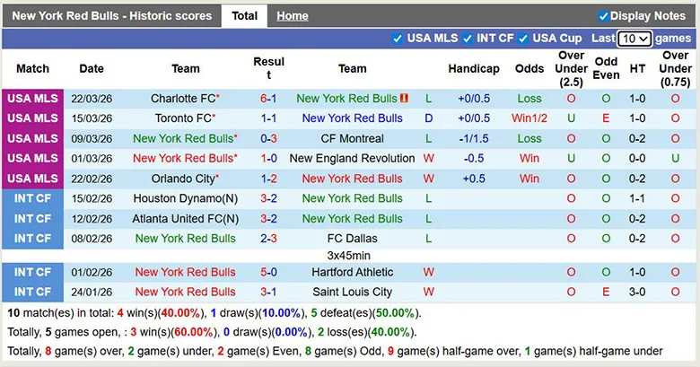 – Thống kê phong độ 10 trận đấu gần nhất của New York Red Bulls.
