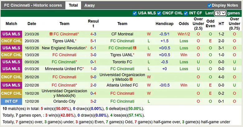 – Thống kê phong độ 10 trận đấu gần nhất của Cincinnati.