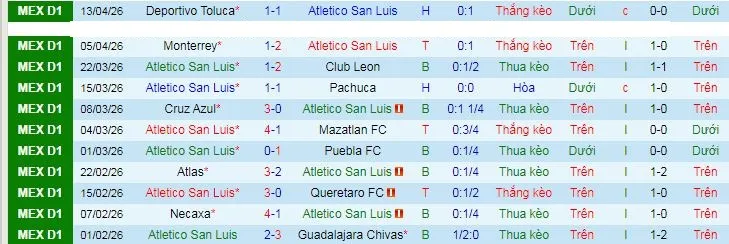 + San Luis thắng 3, hòa 1 và thua 11 trong 15 trận gần nhất trên sân nhà theo kèo châu Á.