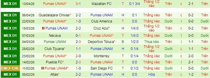 + Pumas UNAM đang có phong độ rất cao theo kèo châu Á khi thắng 9 và chỉ thua 1 trong 10 trận vừa qua theo kèo châu Á.