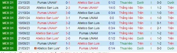 + Cả 3 trận gần nhất San Luis tiếp đón Pumas UNAM trên sân nhà đều có ít nhất 3 bàn thắng.