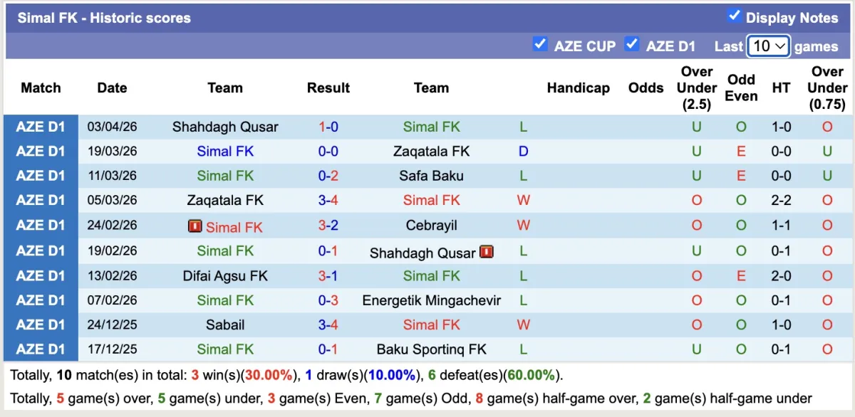 – Thống kê phong độ 10 trận đấu gần nhất của Simal